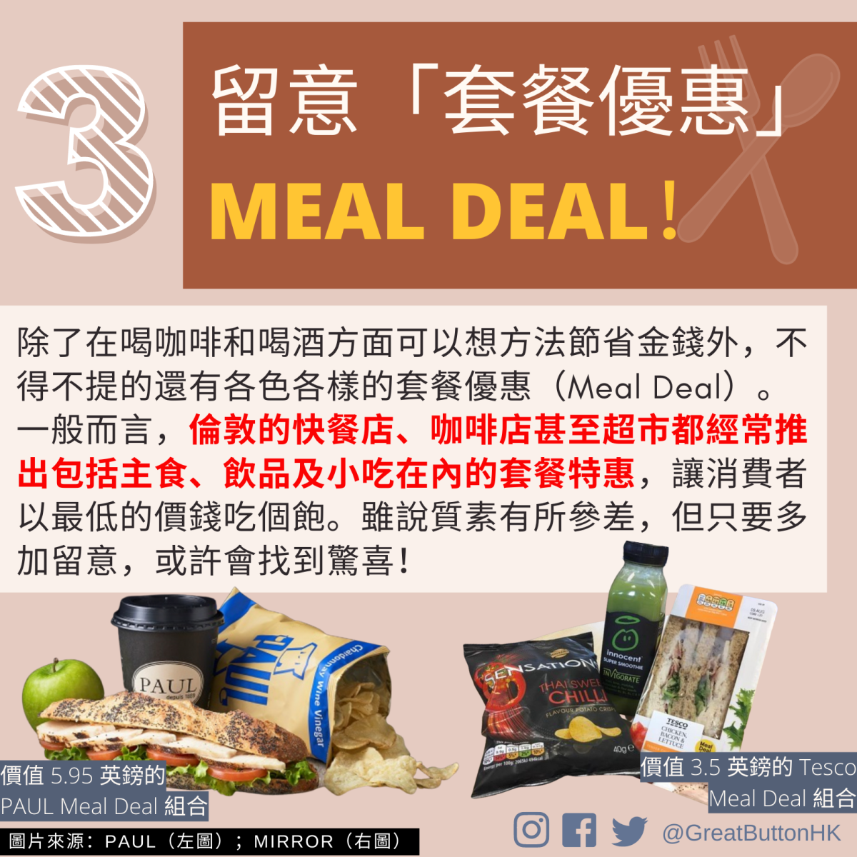 除了在喝咖啡和喝酒方面可以想方法節省金錢外,不得不提的還有各色各樣的套餐優惠(Meal Deal)。一般而言,倫敦的快餐店、咖啡店甚至超市都經常推出包括主食、飲品及小吃在內的套餐特惠,讓消費者以最低的價錢吃個飽。雖說質素有所參差,但只要多加留意,或許會找到驚喜!