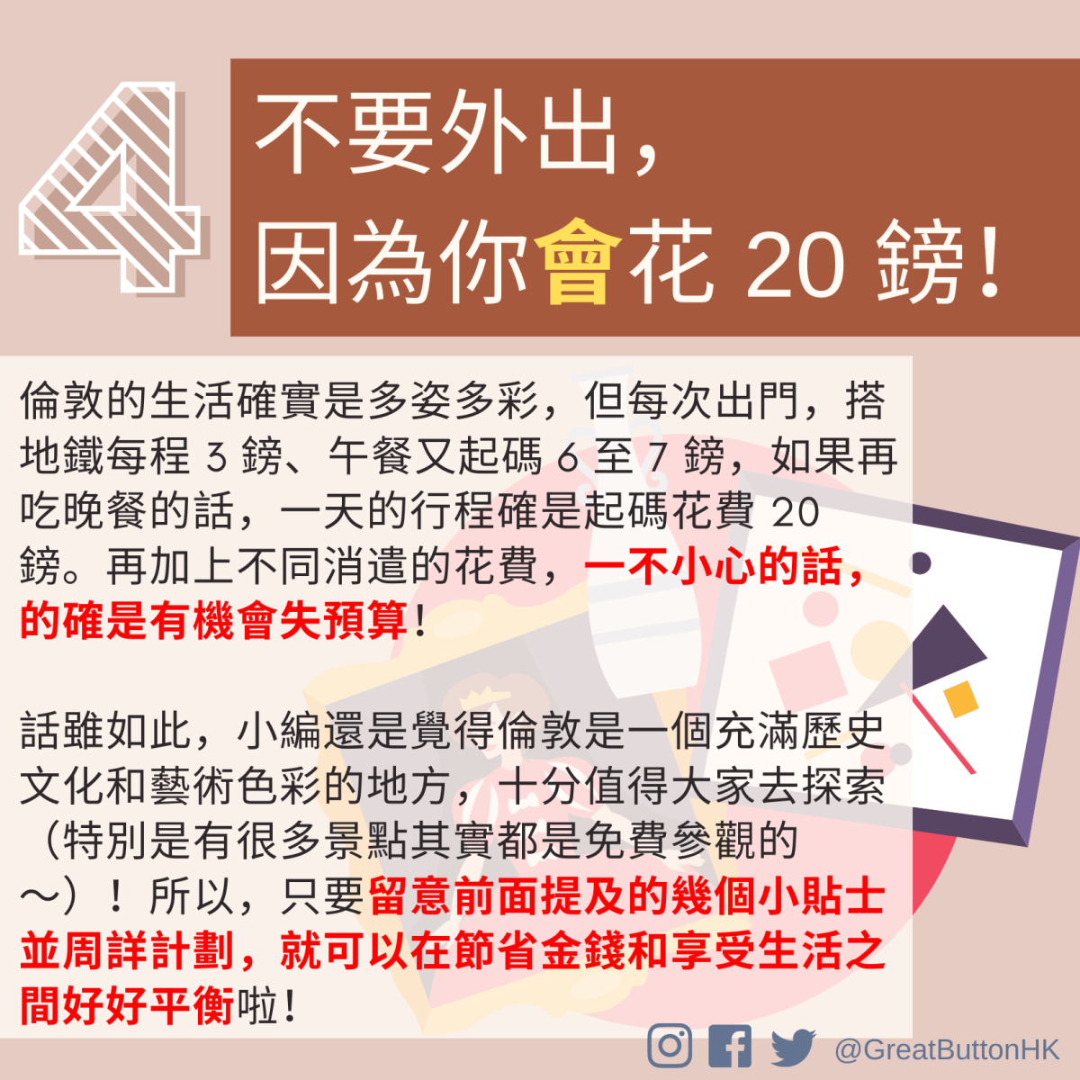 倫敦的生活確實是多姿多彩,但每次出門,搭地鐵每程 3 鎊、午餐又起碼 6 至 7 鎊,如果再吃晚餐的話,一天的行程確是起碼花費 20 鎊。再加上不同消遣的花費,一不小心的話,的確是有機會失預算! 話雖如此,小編還是覺得倫敦是一個充滿歷史文化和藝術色彩的地方,十分值得大家去探索(特別是有很多景點其實都是免費參觀的~)!所以,只要留意前面提及的幾個小貼士並周詳計劃,就可以在節省金錢和享受生活之間好好平衡啦!