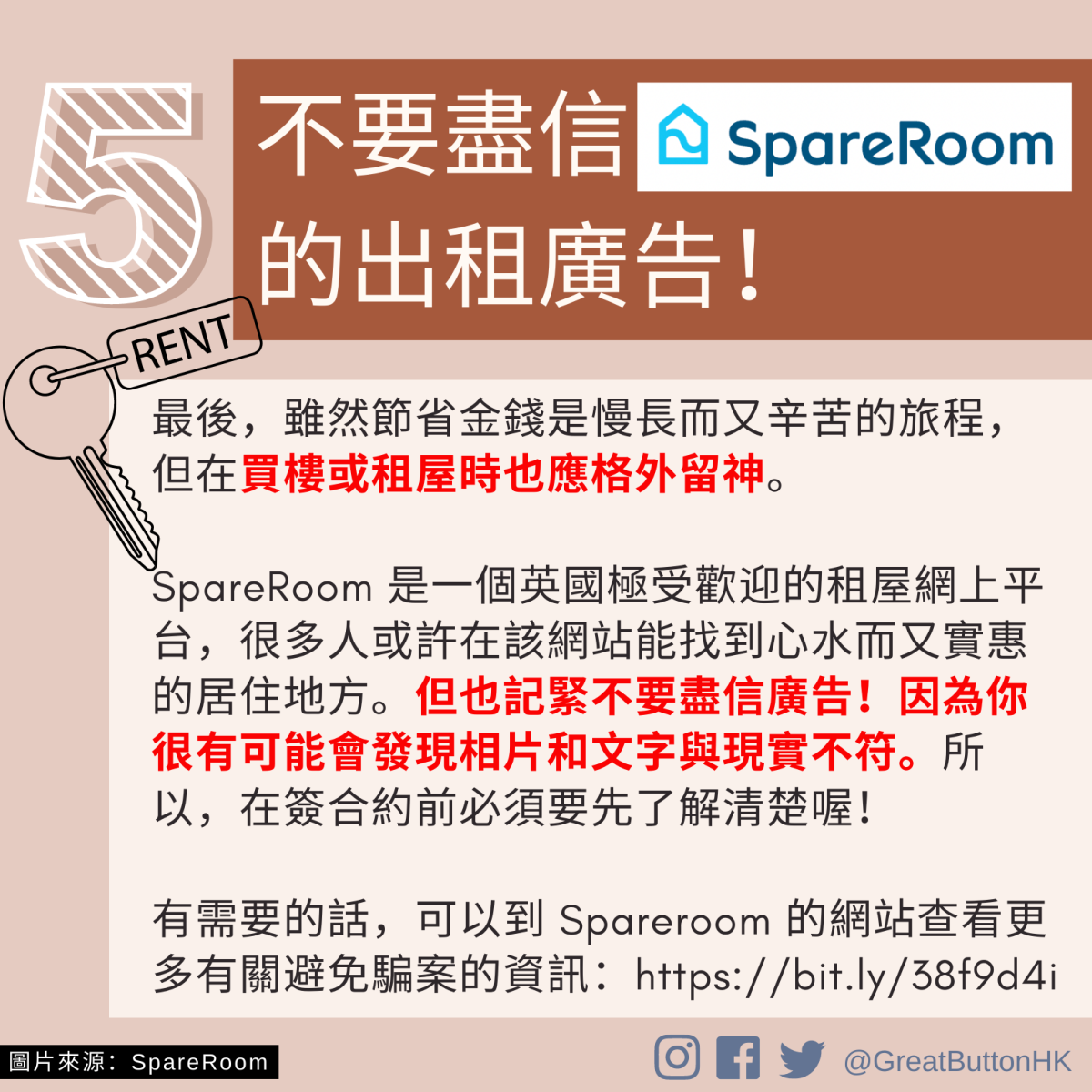最後,雖然節省金錢是慢長而又辛苦的旅程,但在買樓或租屋時也應格外留神。 SpareRoom 是一個英國極受歡迎的租屋網上平台,很多人或許在該網站能找到心水而又實惠的居住地方。但也記緊不要盡信廣告!因為你很有可能會發現相片和文字與現實不符。所以,在簽合約前必須要先了解清楚喔! 有需要的話,可以到 Spareroom 的網站查看更多有關避免騙案的資訊:https://bit.ly/38f9d4i