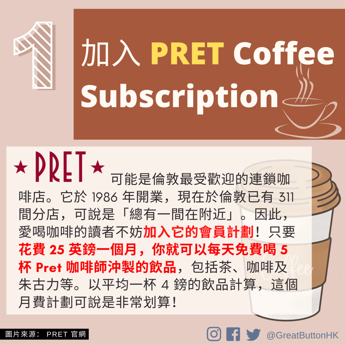 Pret 可能是倫敦最受歡迎的連鎖咖啡店。它於 1986 年開業,現在於倫敦已有 311 間分店,可說是「總有一間在附近」。因此,愛喝咖啡的讀者不妨加入它的會員計劃!只要花費 25 英鎊一個月,你就可以每天免費喝 5 杯 Pret 咖啡師沖製的飲品,包括茶、咖啡及朱古力等。以平均一杯 4 鎊的飲品計算,這個月費計劃可說是非常划算!