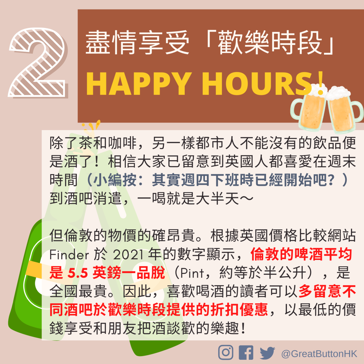 除了茶和咖啡,另一樣都市人不能沒有的飲品便是酒了!相信大家已留意到英國人都喜愛在週末時間(小編按:其實週四下班時已經開始吧?)到酒吧消遣,一喝就是大半天~ 但倫敦的物價的確昂貴。根據英國價格比較網站 Finder 於 2021 年的數字顯示,倫敦的啤酒平均是 5.5 英鎊一品脫(Pint,約等於半公升),是全國最貴。因此,喜歡喝酒的讀者可以多留意不同酒吧於歡樂時段提供的折扣優惠,以最低的價錢享受和朋友把酒談歡的樂趣!