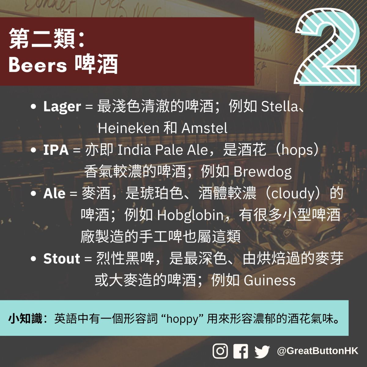 小知識:英語中有一個形容詞 “hoppy” 用來形容濃郁的酒花氣味。