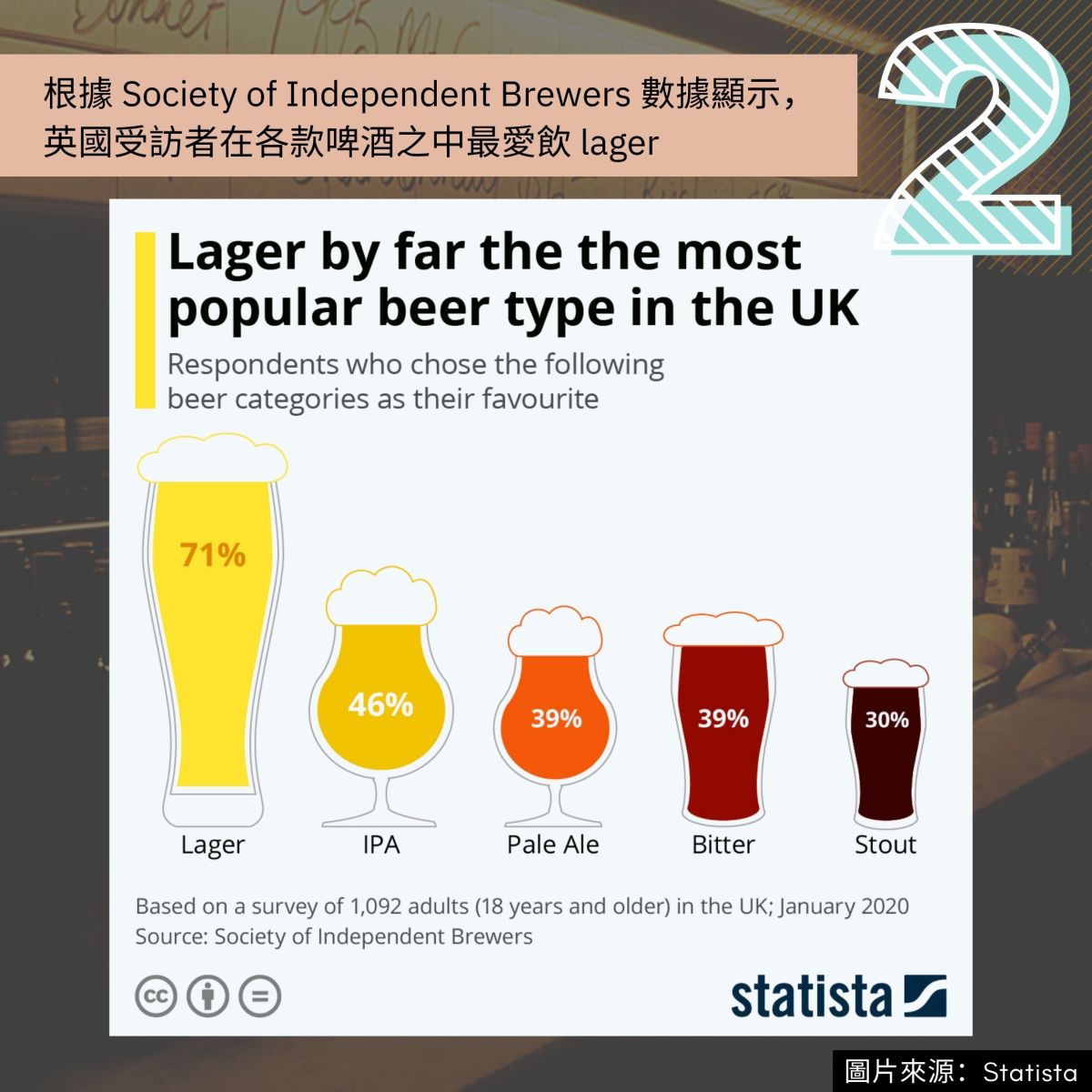根據 Society of Independent Brewers 數據顯示, 英國受訪者在各款啤酒之中最愛飲 lager