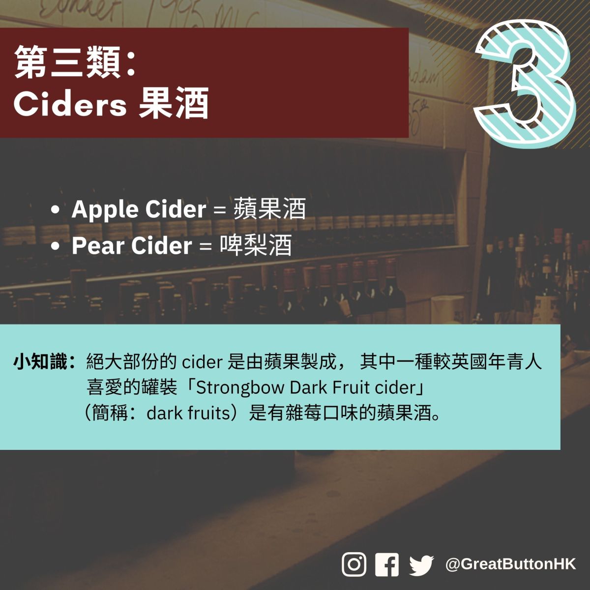 小知識:絕大部份的 cider 是由蘋果製成, 其中一種較英國年青人 喜愛的罐裝「Strongbow Dark Fruit cider」 (簡稱:dark fruits)是有雜莓口味的蘋果酒。