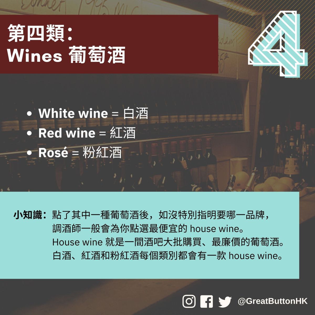 小知識:點了其中一種葡萄酒後,如沒特別指明要哪一品牌, 調酒師一般會為你點選最便宜的 house wine。 House wine 就是一間酒吧大批購買、最廉價的葡萄酒。 白酒、紅酒和粉紅酒每個類別都會有一款 house wine。