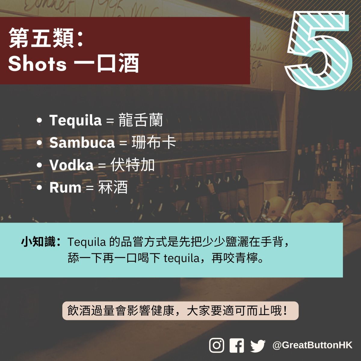 小知識:Tequila 的品嘗方式是先把少少鹽灑在手背, 舔一下再一口喝下 tequila,再咬青檸。