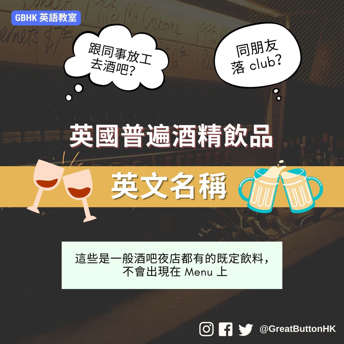 夏日將至,英國日照時間越來越長,很多人無論是放工後或週末都喜愛到酒吧(pub 或 bar)甚至夜店(nightclub)輕鬆一下。 今日,我們想為大家介紹英國最普遍的酒精飲品名稱。 請注意此名單並不包括雞尾酒(cocktails),因為每間酒吧或夜店通常都會有自己的 cocktail menu,列明他們提供的雞尾酒選擇。