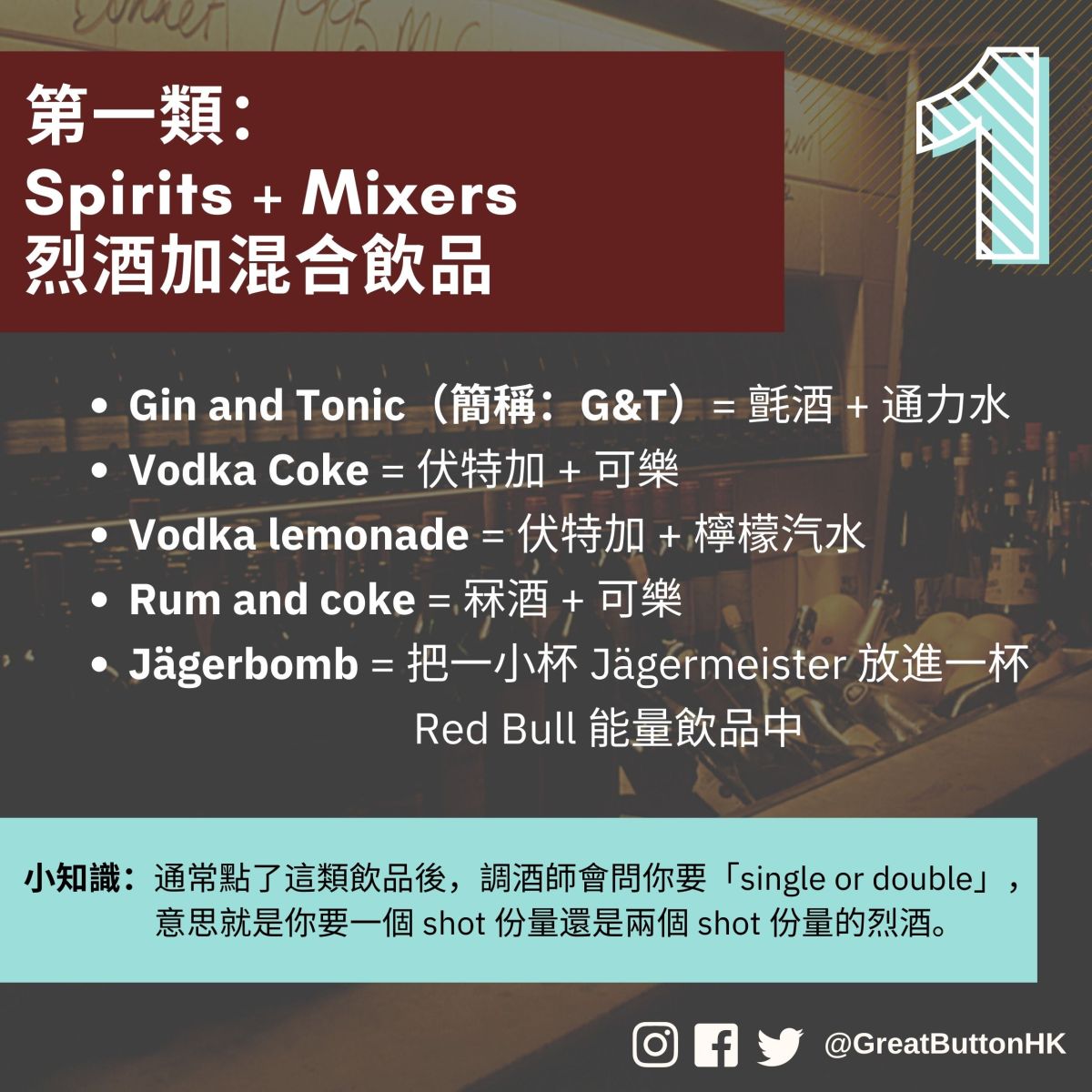 小知識:通常點了這類飲品後,調酒師會問你要「single or double」, 意思就是你要一個 shot 份量還是兩個 shot 份量的烈酒。