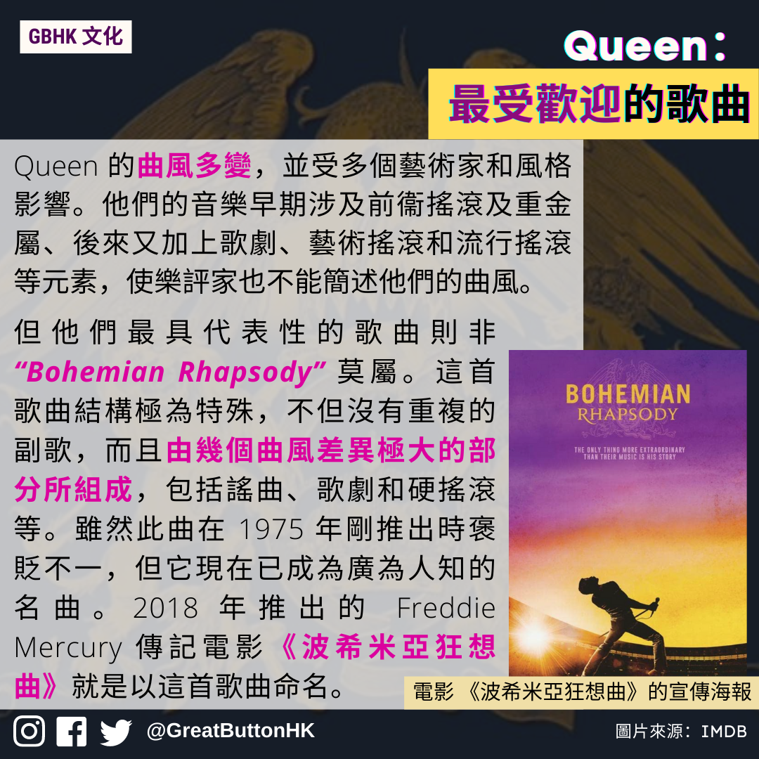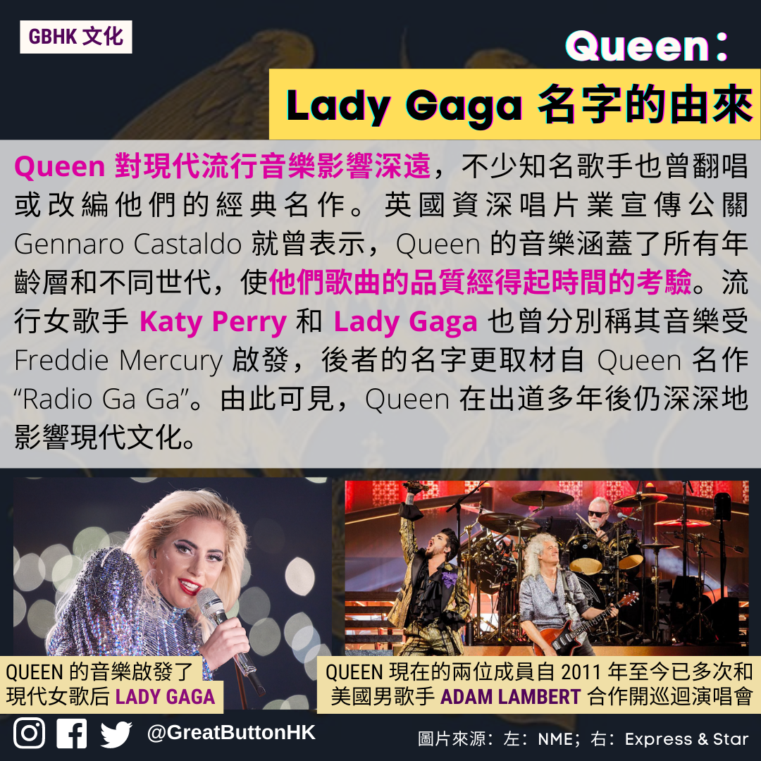 *英語小貼士:讀者可留意一下這隊樂隊的名字 Queen 前面是沒有冠詞(article)的。因此,大家在用英語表達自己是他們的歌迷時可說 “I’m a fan of Queen.” ,但切記不要與 “I’m a fan of THE Queen.” (包含冠詞 “The” )混淆,因為 The Queen 在英國的意思是英女王。當然,若樂隊 Queen 和英女王都是你的偶像,你便可以說 “I’m a fan of Queen and The Queen” 了~