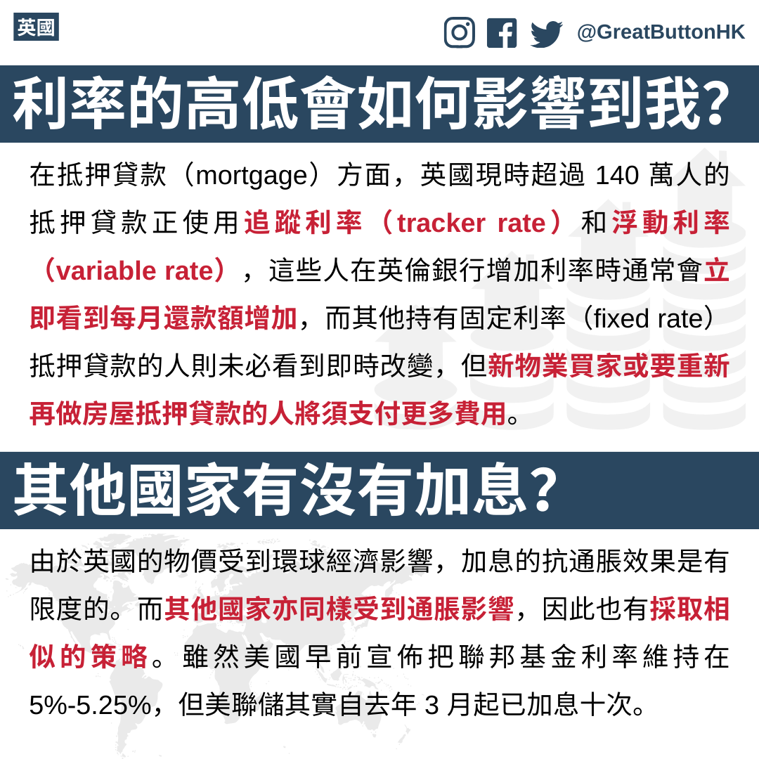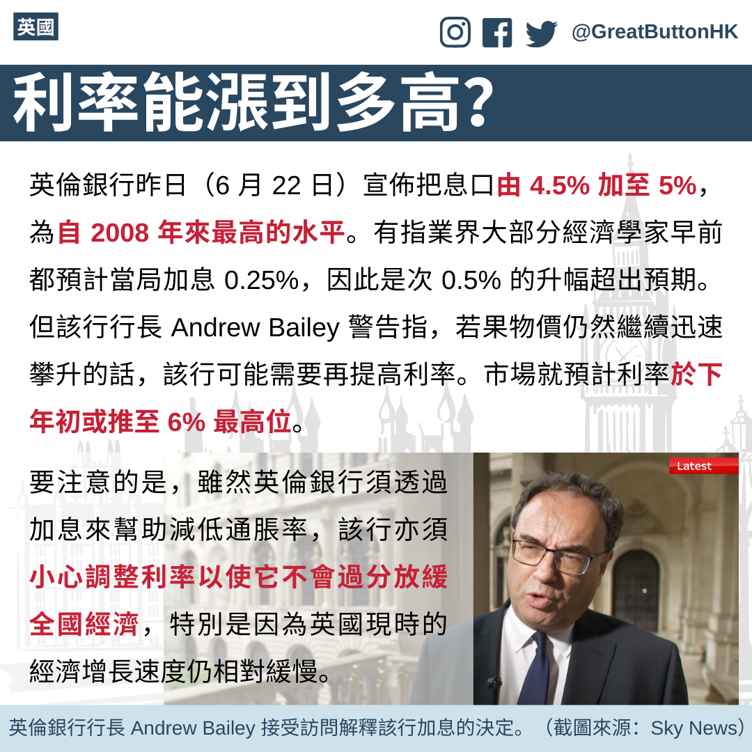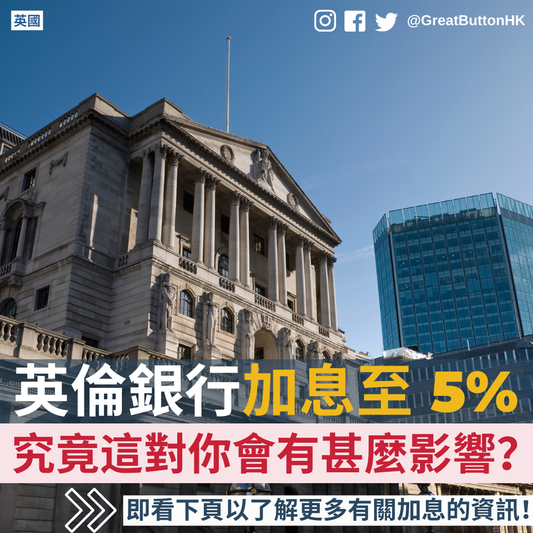英倫銀行(Bank of England)昨日(6 月 22 日)宣佈把息口由 4.5% 加至 5%,這為自 2008 年來最高的水平。有指業界大部分經濟學家早前都預計當局加息 0.25%,因此是次 0.5% 的升幅超出預期。為了讓各位讀者更了解加息為生活帶來的影響,我們今天特地參考了 BBC 所提供的資料而製作了一個資訊包和大家分享,希望能為讀者解答一些疑問。