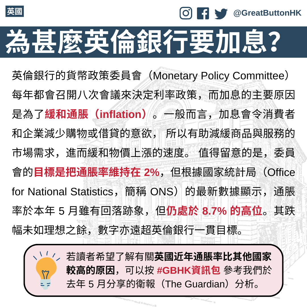 若讀者希望了解有關英國近年通脹率比其他國家較高的原因,可以按 #GBHK資訊包 參考我們於去年 5 月分享的衛報(The Guardian)分析。