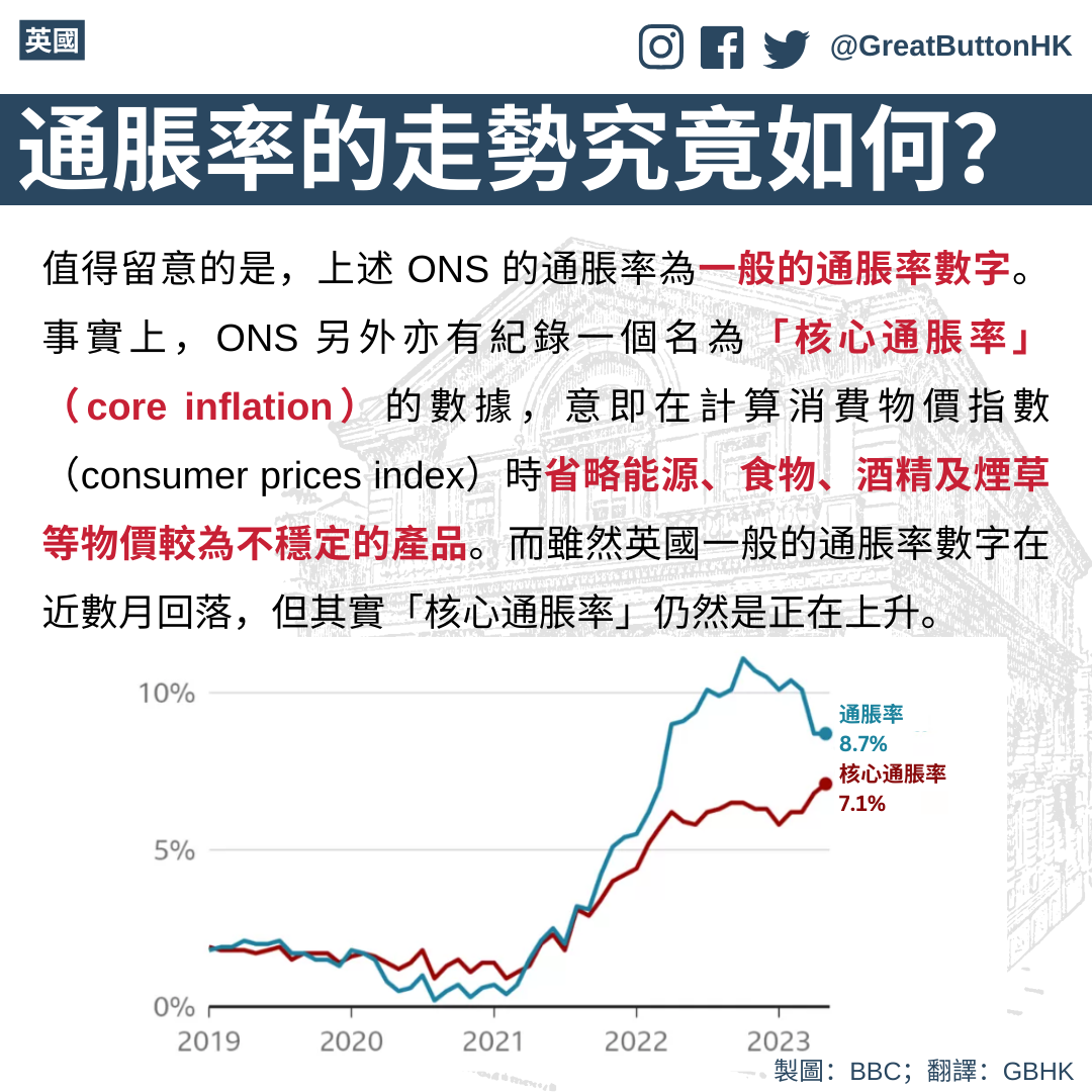 值得留意的是,上述 ONS 的通脹率為一般的通脹率數字。事實上,ONS 另外亦有紀錄一個名為「核心通脹率」(core inflation)的數據,意即在計算消費物價指數(consumer prices index)時省略能源、食物、酒精及煙草等物價較為不穩定的產品。而雖然英國一般的通脹率數字在近數月回落,但其實「核心通脹率」仍然是正在上升。