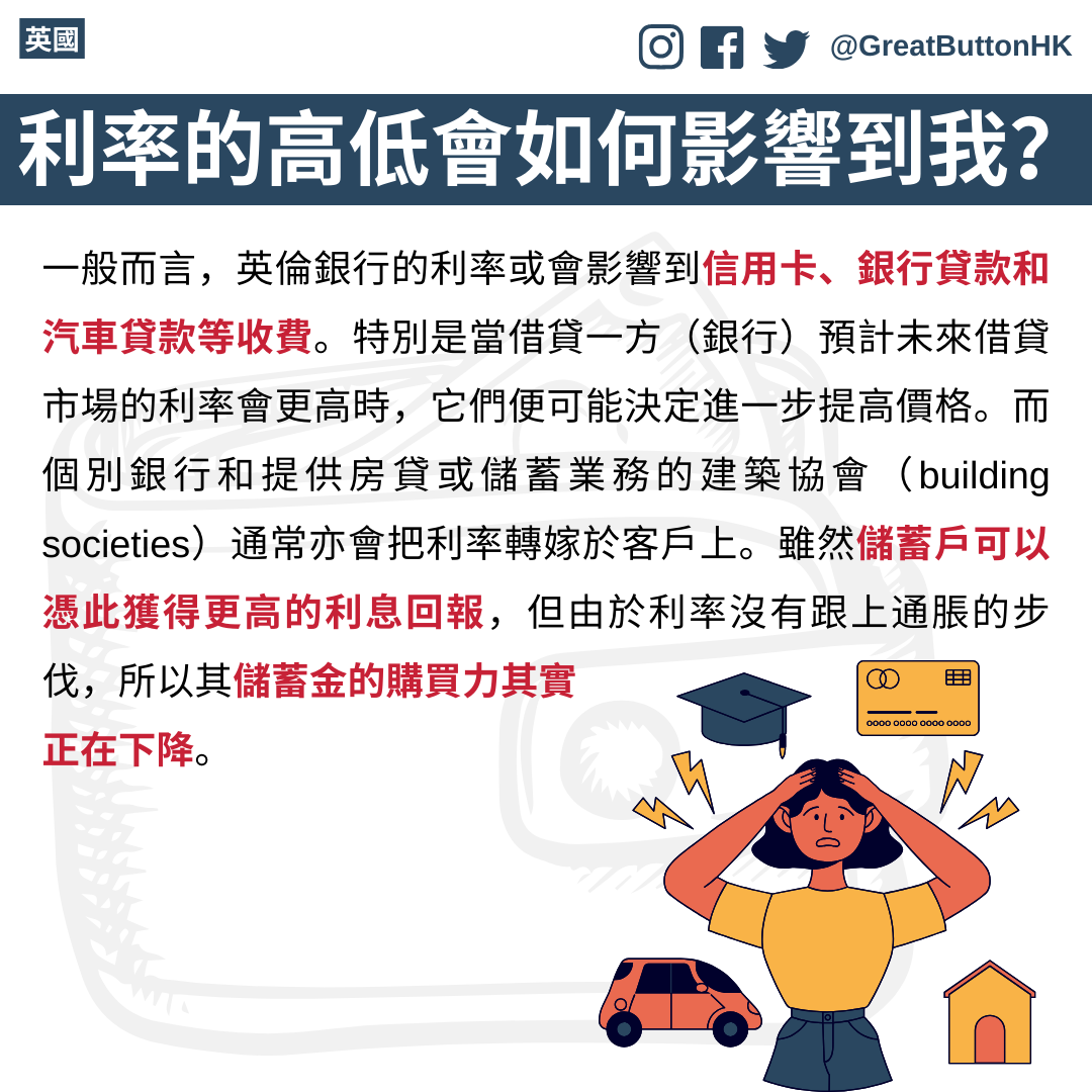 一般而言,英倫銀行的利率或會影響到信用卡、銀行貸款和汽車貸款等收費。特別是當借貸一方(銀行)預計未來借貸市場的利率會更高時,它們便可能決定進一步提高價格。而個別銀行和提供房貸或儲蓄業務的建築協會(building societies)通常亦會把利率轉嫁於客戶上。雖然儲蓄戶可以憑此獲得更高的利息回報,但由於利率沒有跟上通脹的步伐,所以其儲蓄金的購買力其實正在下降。