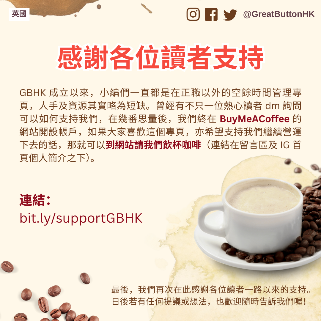 不經不覺,GreatbuttonHK 專頁已快正式成立兩年了!過去的時間裏,小編們每天都努力發佈帖文,希望能讓讀者們緊貼英國的新聞時事和資訊,這亦是我們創辦 GBHK 的初心—希望建立一個繁體中文的英國新聞渠道,讓在英國的各位能夠更了解這裡的時事議題、文化及其他重要資訊。