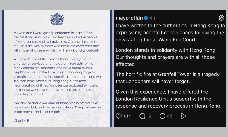 倫敦市長昨日亦在社交媒體 X 及 Threads 上發表聲明,指自己「已去信香港當局就宏福苑發生的毁滅性火災表達深切慰問」(”written to the authorities in Hong Kong to express my heartfelt condolences following the devastating fire at Wang Fuk Court”)。他補充,倫敦與香港站在一起,與受影響的人們同在及為他們祈禱。他又指,Grenfell Tower 發生的駭人火災是一場倫敦人永不會忘記的悲劇,有鑒於此經驗,他已向香港當局表示倫敦應急隊伍(London Resilience Unit)可為香港的復原工作提供支援。