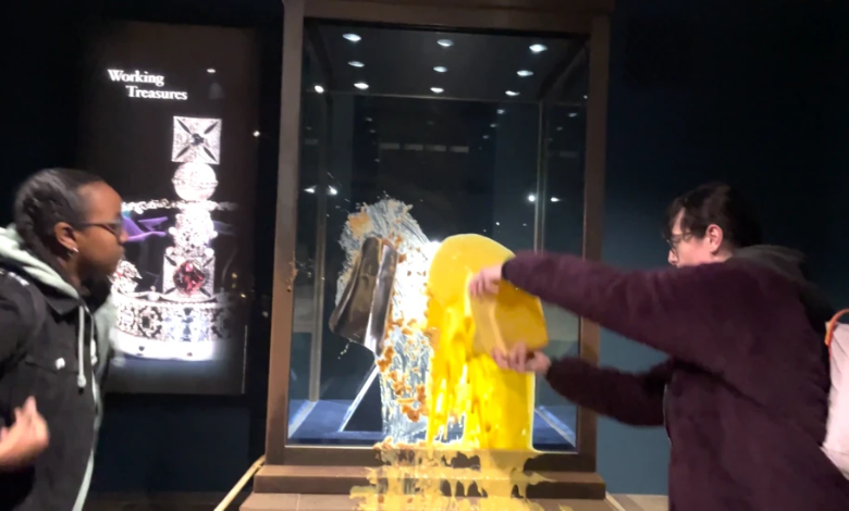 據 BBC 報導,四名來自社運團體 Take Back Power(被視為 Just Stop Oil 的分支組織)的示威者於昨日(12 月 6 日)早上向倫敦塔(Tower of London)內一個存放國王御用王冠的展示櫃掟上蘋果金寶(apple crumble)及奶黃吉士(custard)。警方其後以涉嫌刑事損壞拘捕四人。