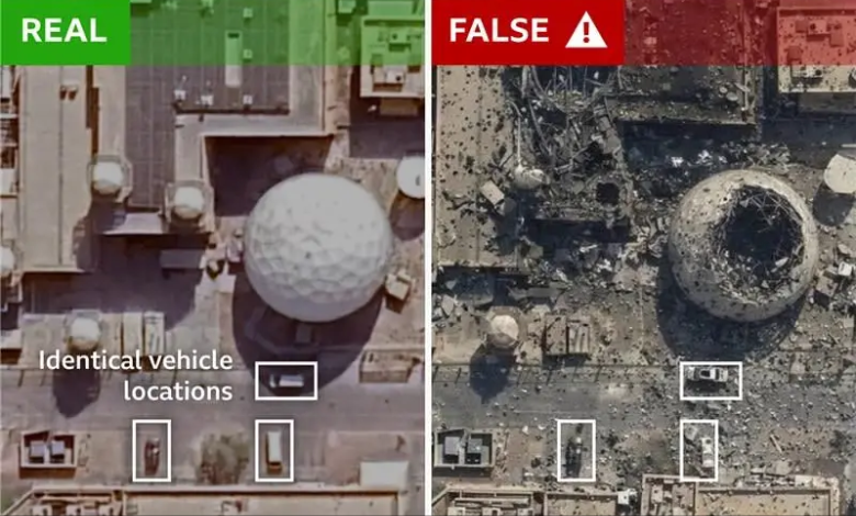 除短片外,BBC Verify 亦揭發有衛星圖遭偽造。有親伊朗國家媒體在社交平台 X 發佈美軍在巴林基地看似受重創的圖像。經調查後發現其圖片來源為 2025 年公開的真實衛星相,而該偽造圖像是由 Google AI 工具編輯而成的;顯示該圖片遭移花接木的證據為基地外停泊三輛車的位置在真實的衛星圖像與 AI 圖像中是完全一致的。有部分網民向內建於 X 中的 AI 工具 Grok 查證假短片的真偽,惟 Grok 多次錯誤指假片為真,反令假資訊進一步傳播。