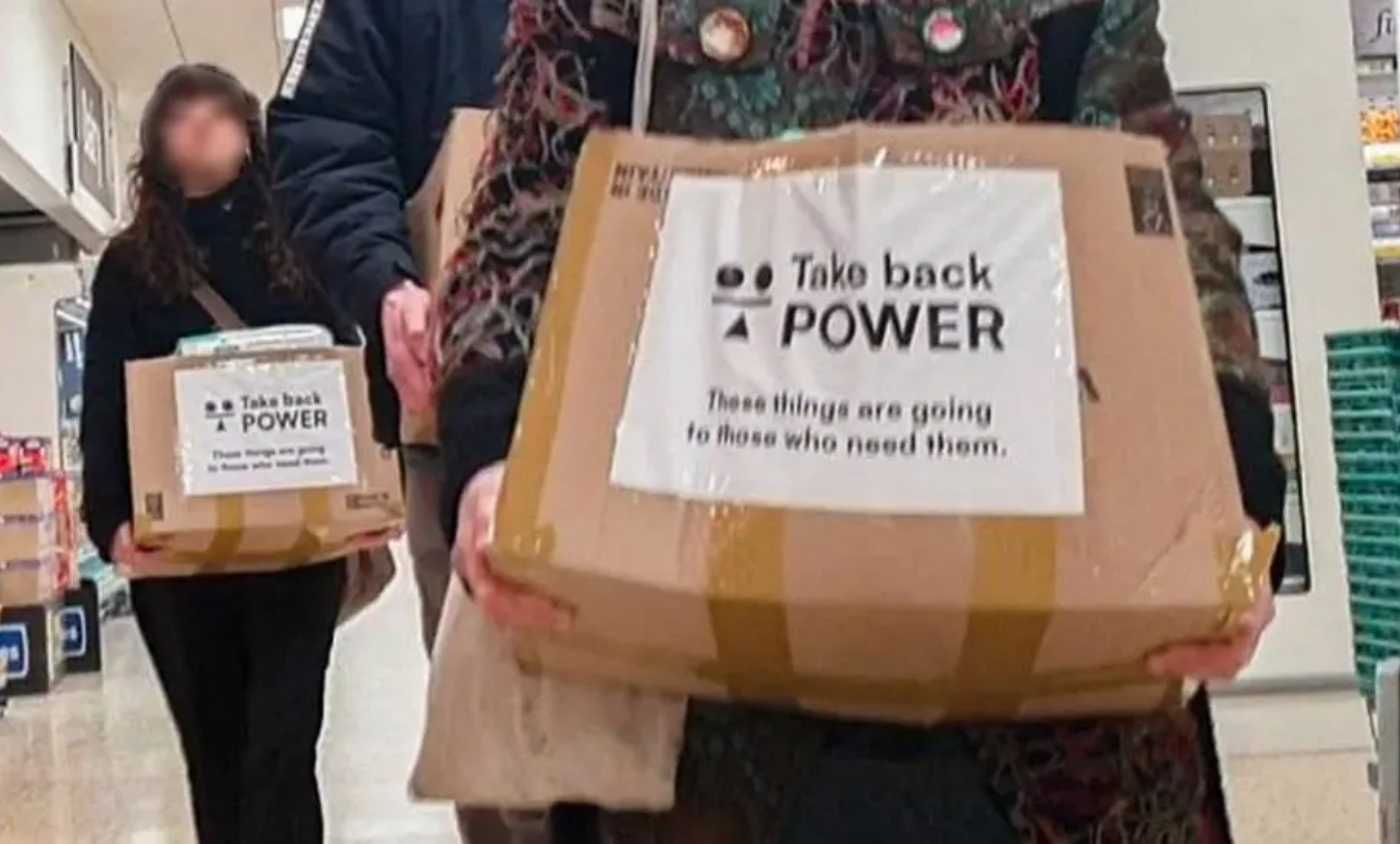 案件與一個名為 Take Back Power 的團體有關,該組織自稱為「非暴力公民抗命團體」(”a nonviolent civil-resistance group”),並主張在從大型企業手上取回必需品,再分發予有需要的社區人士。(原句:”taking back essential items and groceries from stores owned by corporations and billionaires, and helping to give back these necessities to the local communities who need support the most”)。Take Back Power 表示其支持者曾於 3 月「未付款就離開商店」(”left the shops without paying”),再將偷來的物資捐贈予食物銀行。警方相信相關人士計劃在全國多地進行類似行動,將貨品偷走並重新分發到其他地方。