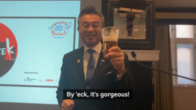日本駐英大使在活動期間 暢飲啤酒兼大叫品牌口號 引來在場人士歡呼